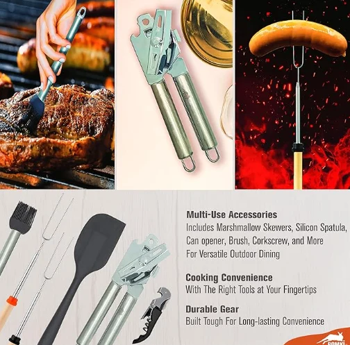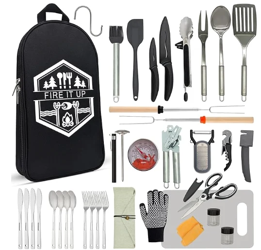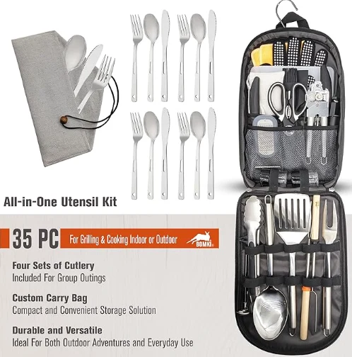 Kanpoko Camping Cooking Storage Bag Poltsa 35 PC Camping Sukaldaritza tresnen multzoa konponbide osoa da kanpoko sukaldaritzarako. Kanpineko sukaldeko multzoa eta kanpin tresnak biltzen ditu. Multzoa zure Camping Sukaldaritza Essentials guztiei erantzuteko diseinatuta dago, ezinbestekoak diren zure kanpinean