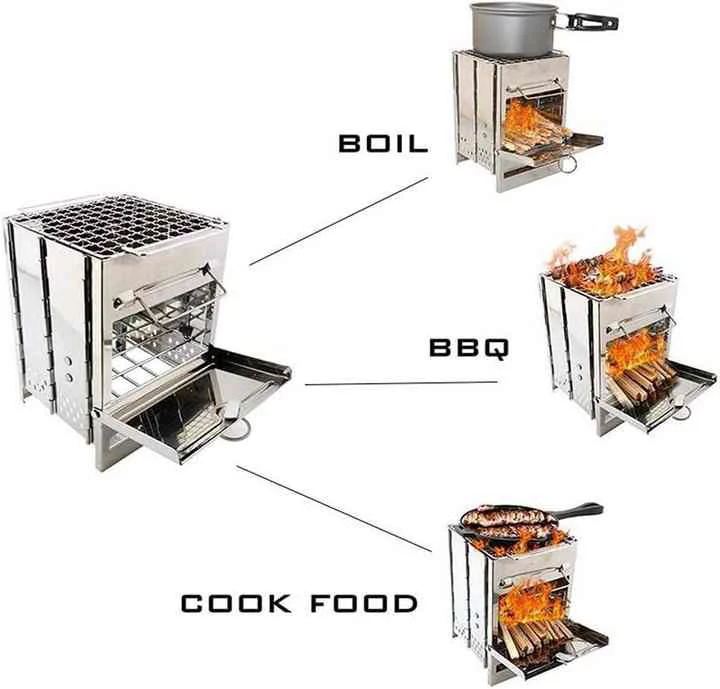 Altzairu herdoilgaitzezko mini kasete sukaldea, altzairu herdoilgaitzez eginda, posible da egurrezko suziri sukaldea luzatzea. Oso erosoa da aurrera eramatea.