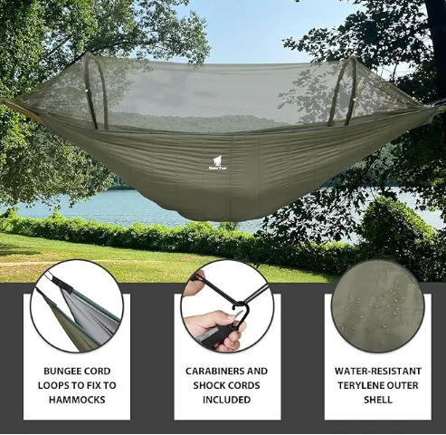 Bidaiak Kanpineko hamaka, lo egiteko poltsa baten erosotasuna eta hamaka bat isolatzea, errazagoa da edozein tamaina estandarraren gainean. Ezin hobea da kanpin, motxila, ehiza, kanpoko jarduerak, mendizaletasuna