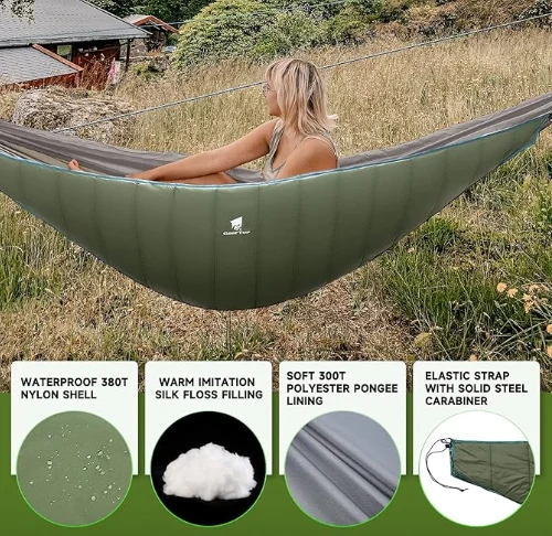 3 - 4 denboraldi hamaka-edredunak 41 ° F-ko 68 ºF-ko tenperaturarako aproposa da; Ezin hobeto moldatzen da hamaka zintzilikatzeko, haizeak ezkutatzen zaituela eta berotu egiten zaitu.